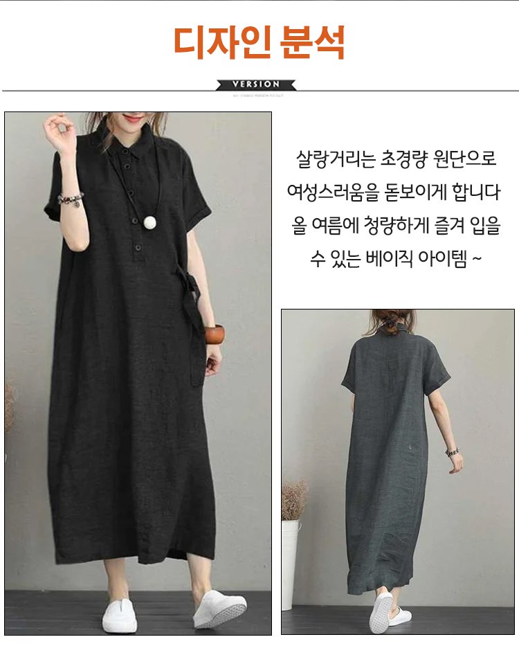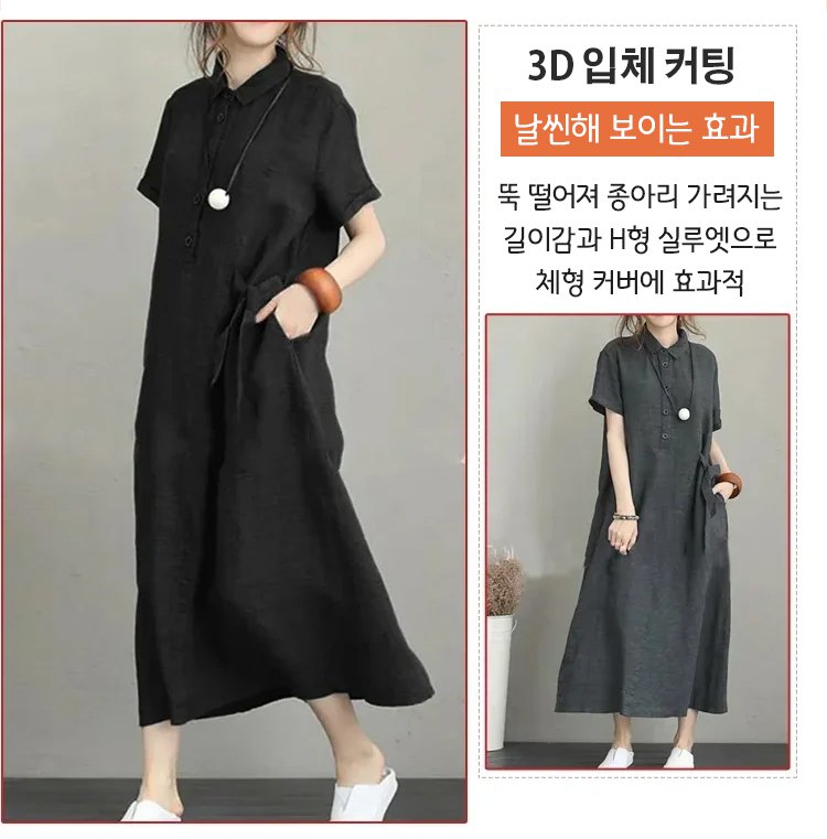 통기성 면 마 원단, 낙낙한 핏감과 롱한 길이감으로 체형 보정에 효과적이며 여성스러운 라인을 살려주는 베이직 아이템!